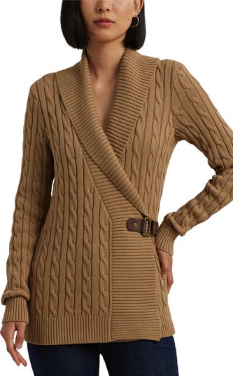 A golden buckle engraved with the brand's logo secures the wrap design of this cable-stitch cotton sweater knit with a cozy shawl collar.