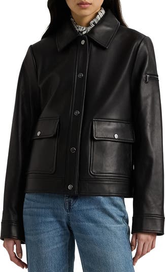 Inspired by the silhouette of a button-up shirt, this smooth leather jacket is sleekly tailored and topped with a pointed collar.