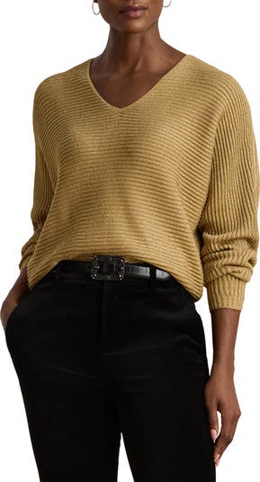 Fine metallic threads light up the ribbed stitches of this sweater knit with low dolman sleeves that further the slouchy, laid-back look.