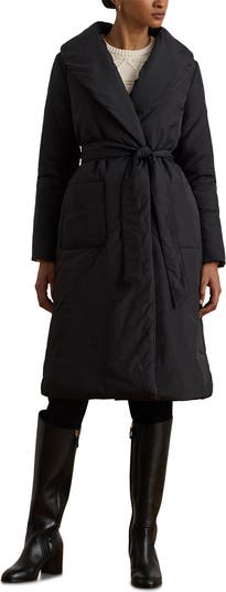 A oversized collar enhances the sophistication of this belted puffer jacket cut in a longline silhouette.