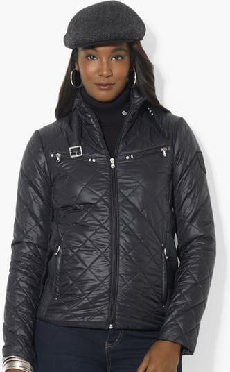 Shirred side and sleeve panels enhance the sleek silhouette of a diamond-quilted jacket. Polished details include a quartet of riveted zip pockets and a buckled tab that fastens at the back of the neck.