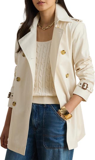 Get lightweight coverage as the cold lossens its grip in this timeless trench coat cut with an abbreviated length in a polished double-breasted silhouette.