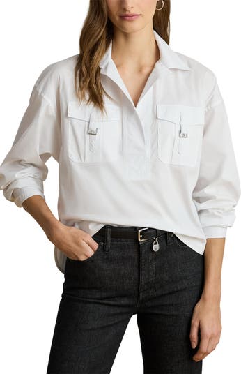Utility inspo reveals itself in the tab-cinched pockets of this shirt that takes a refined turn thanks to the silky stretch-cotton fabric that gives this hard-working style a bit of graceful drape.