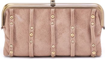 Burnished studs add elegant edge to a leather clutch that organizes all your essentials and fits many phones.