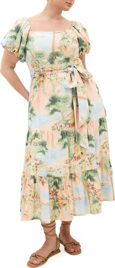 Made of an airy linen-enhanced blend, this sundress features a fitted bodice with a smocked back panel and a tiered skirt that's detailed with on-seam pockets.