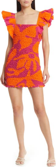 A vivacious swirling print emboldens this close-fitting mini designed with sweet smocking and puffed cap sleeves.