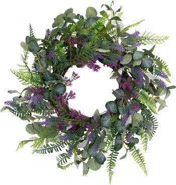 Lavender and Mixed Foliage Artificial Floral Spring Wreath, Purple and Green - 22-Inch