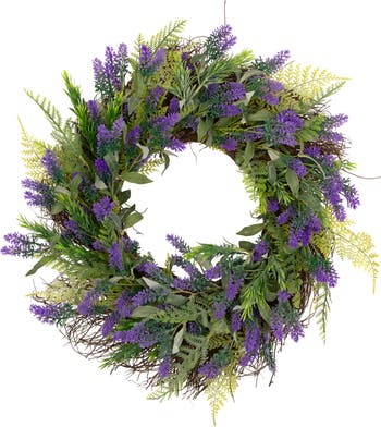 Add a regal pop of color to your home with our life-like artificial lavender wreath. Featuring lavender flowers intertwined with leafy green foliage. Hang on any wall or door or use as a centerpiece with your favorite candle in the center. Product Features: Purple lavender wreath Flowers are surrounded by green foliage and twigs Natural twig grapevine backing for hanging Recommended for indoor use only - if using outdoors place under a covered area No assembly required - wreath comes in 1 piece Dimensions: 24" diameter (measured from outermost edge to outermost edge across the wreath) Inner dimensions: 9.5" diameter Material(s): polyester/twig/plastic/wire