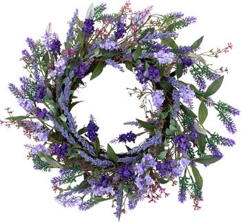 Add a regal pop of color to your home this spring and summer, with our life-like artificial lavender wreath. Featuring realistic purple silk flowers intertwined with a natural twig base. Hang on any wall or door or use as a centerpiece with your favorite candle in the center. Product Features: Purple lavender wreath Surrounded by small purple flowers Accented with small green leaves Natural twig grapevine backing for hanging Recommended for indoor use - if using outdoors place under a covered area No assembly required - wreath comes in 1 piece Dimensions: 18" diameter (measured from outermost edge to outermost edge across the wreath) Inner ring dimensions: 9" diameter Material(s): polyester/twig/plastic/wire