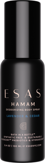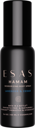 - HOW IT WORKS : Inspired by the ancient Hamam ritual, Esas Hamam Deodorizing Body Spray is your "bath in a bottle," designed to purify, cleanse, and refresh. Rooted in a tradition that dates back to the 14th century, this unique body spray brings the essence of Roman baths into the modern day. Scientifically formulated with the purest ingredients, including Certified Organic Botanical Alcohol*, Witch Hazel, Coconut-Derived Glycerin*, and Esas DeoScent™ Sugarcane Ferment*, it effectively cleanses, deodorizes, and refreshes your skin wherever you go. Enriched with hydrating hyaluronic acid, vitamin E, and antioxidant-rich grape leaf tincture, this spray not only purifies but also nourishes, leaving your skin feeling revitalized and lightly scented. Perfect for an on-the-go refresh, it's the ultimate solution for staying clean, refreshed, and fragrant throughout your day.