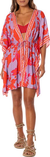 Floral trim and bright colors call attention to this breezy cover-up that can closed with drawstring ties at the waist