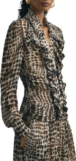A tumble of ruffles froths the front of this leopard-spotted top that owes its curve-highlight fit to the densely ruched seams.