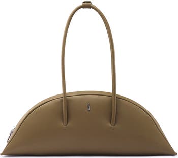 Signature logo hardware highlights the architectural profile of a bowler-inspired shoulder bag shaped from rich leather and suspended by a pair of rolled straps.