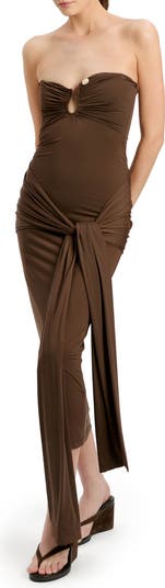 Elegant draping adds fluid movement to this curve-skimming strapless dress that exemplifies modern elegance.