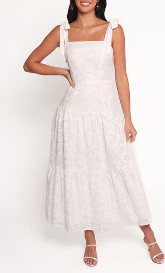 Monochrome flowers fall around an elegant sundress in a fit-and-flare silhouette with a tiered skirt and adjustable tie straps.