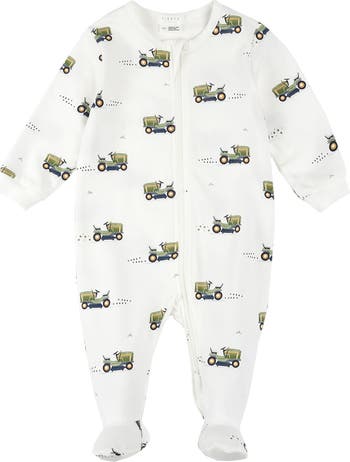 Riding lawnmowers get the job done on footie pajamas made from stretchy organic cotton and secured with a front zip to make changing a breeze.
