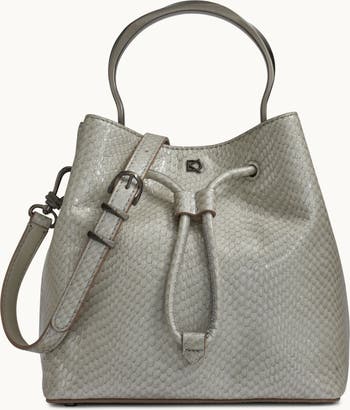 Accented with a chic metal handle, this bucket bag by Donna Karan is crafted in leather and has a removable crossbody strap to go handsfree