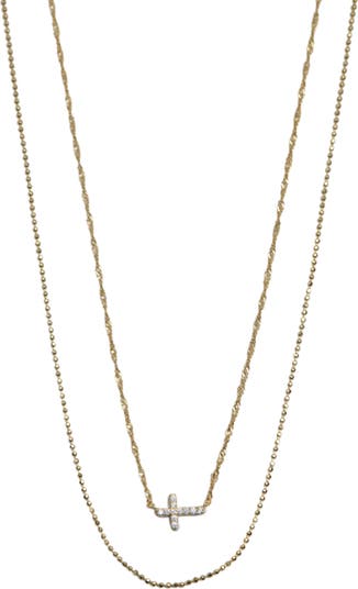 A gleaming ball chain is paired with a shorter complementary chain centered with horizontal cross pendant pavé set with cubic zirconia for a distinctive devotional layered necklace made from sterling silver plated in 18-karat gold.
