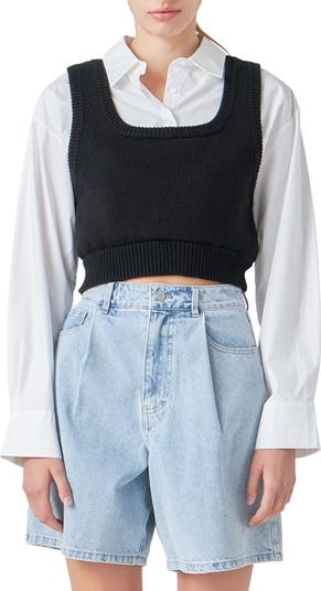 Unlock a two-piece look with one-and-done ease when you choose this layered shirt designed to look like a cropped, wool-kissed vest over a crisp button-up.