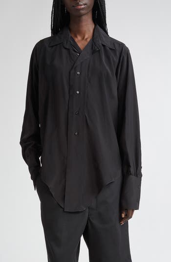 A layered hem lends playful dimension to a long-sleeve shirt crafted from fluid Italian satin in a relaxed, roomy fit.