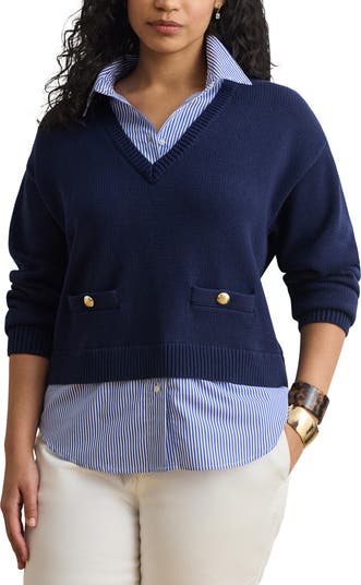 A striped broadcloth shirt inset and brassy etched buttons lend a bit of preppy polish and a layered look to this combed cotton sweater.