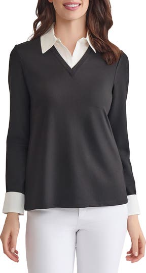 Effortlessly create a polished layered look with this long-sleeve V-neck top featuring a peek of white shirting at the collar and cuffs.