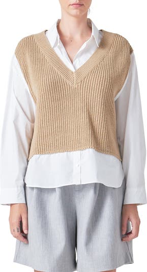 The look of two pieces with the ease of one, this top features a chunky sweater-vest layered over a lightweight poplin button-up shirt.