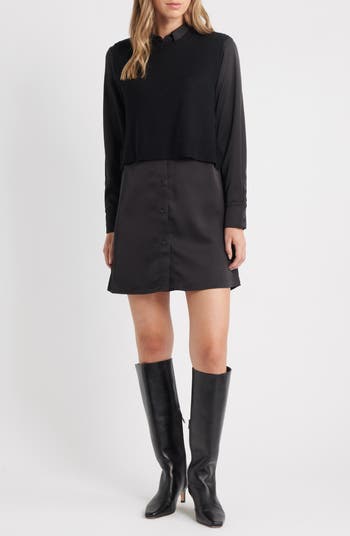 Achieve a classic layered look with this style that pairs a silky long-sleeve shirtdress with a tonal sweater vest.