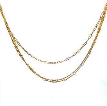 A layered necklace set designed to create a polished, effortless stacked look in one easy piece. Finished in 18K PVD gold plating over stainless steel, this waterproof and hypoallergenic style measures approximately 16.5 inches with an additional 2-inch extender and features a 3-in-1 design.