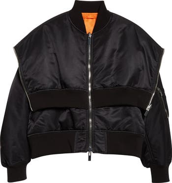 Noir Kei Ninomiya's avant-garde, experimental construction brings sculptural intrigue to this nylon-twill bomber jacket featuring a draped panel that zips up to create a slouchy hood exploding with neon-orange ruffles.