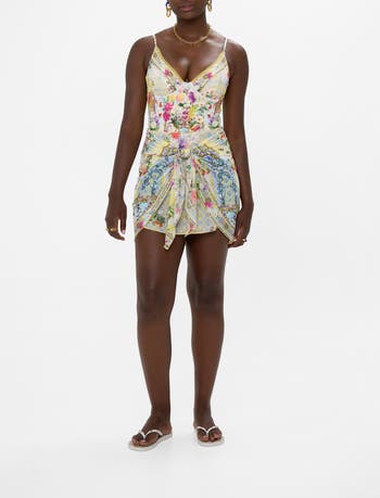 Designed in Australia, The Flor Fantastica Layered Short Sarong With Tie Front is inspired by the romantic and forever artful Queluz Palace Lovingly handcrafted, this luxury sarong skirt features a fitted silhouette that showcases an elegant tie front layer falling into a mini length hemline.
