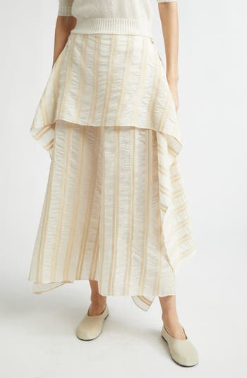 The rippling upper layer of this lightly crinkled and striped silk skirt can be buttoned or tied multiple ways to change up the sculptural drama of this asymmetric piece.