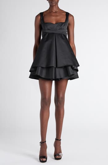 This leg-baring taffeta minidress is cut with a sharp square neck inset with a sweetheart profile, while the layered high-low skirt reflects the fabric's sheen in undulating folds. Narrow straps crisscross and secure in back to cinch in the Empire-waist silhouette.