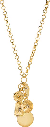 A collection of charms featuring radiating lines and crystals brings dimensional shine to this rolo chain necklace.
