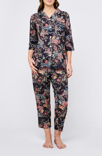 Beribboned blooms tell a sweet style story for summery cotton voile pajamas designed with shortened sleeves and an abbreviated leg silhouette.