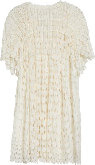 Inspired by traditional Alençon needle lace, this striking and skin-baring minidress is lightly pleated around the neckline and shoulders before flowing gracefully into a classic trapeze silhouette. For added flair, corded rope ties secure the back closure and cinch the short sleeves.