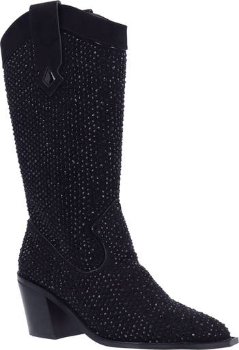 Sparkling rhinestone embellishments add glamorous appeal to a Western-inspired boot balanced by a pointy toe and stacked block heel.
