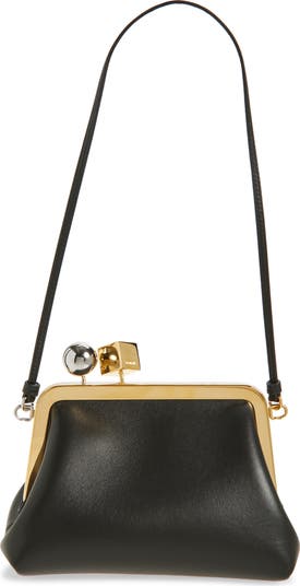 A frame closure emphasizes the vintage inspiration of this calfskin-leather bag topped with house-signature mixed-metal sphere and cube charms.