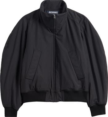 Architectural play unfolds in an insulated bomber that swells into gentle curves then squares off at the hem for a calculated contrast. The structural stand collar feels deliberate and the taut rib trim calibrates volume for a sculpted finish, while prominent angled pockets and a tonal monogram punctuate the front.