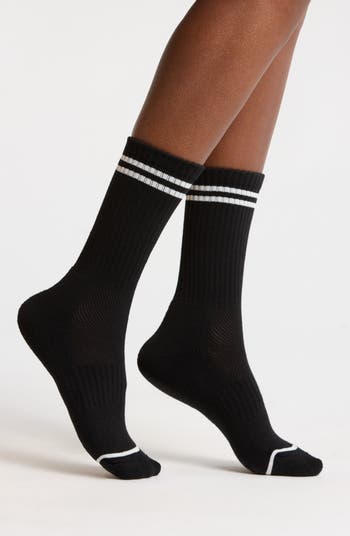 Contrast stripes add retro-sporty charm to comfy, midweight crew socks knit with mesh at the top of the foot for added breathability.