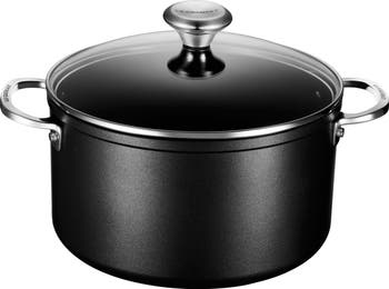 Made to be four times stronger than previous versions, this stockpot offers a textured, triple-reinforced coating that browns well and wipes clean. Hard anodized-aluminum construction and a fully encapsulated stainless steel base resist warping and offer even temperatures, and the tempered glass lid allows you to watch your food as it cooks. Stay-cool ergonomic handles make it easy to manipulate the pan, and the pan is oven safe to 500 degrees, while the lid is safe to 425 degrees.