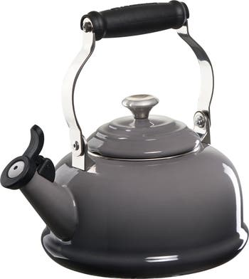 This classic tea kettle is designed to stand the test of time with a durable carbon-steel composition and a stunning porcelain enamel finish. The flip lid features a single-tone whistle to let you know when water has reached a rolling boil, while a heat-resistant, ergonomic handle ensures safe and easy pouring. Perfect for preparing French press coffee, oatmeal and much more in addition to tea. Compatible with gas, electric, ceramic, halogen and induction heat sources, this kettle is designed with a generous base to ensure maximum contact and a quick boil.