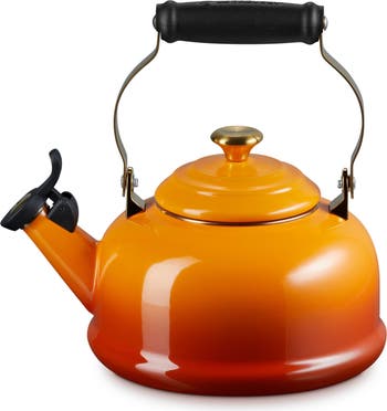 Gilded accents against the enameled finish add a holiday-worth touch to this classic tea kettle.