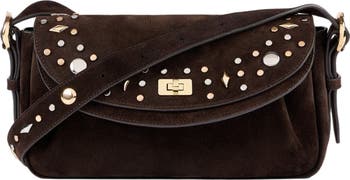 Suede bag with metal studs, featuring a double flap with swivel clasp, for shoulder or crossbody wear.