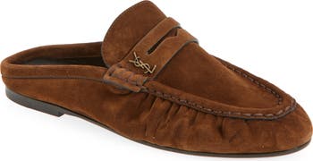 The label's iconic Cassandre monogram hardware shines at the penny strap of this loafer-style mule crafted from supple Italian suede with on-trend gathering at the moc toe.