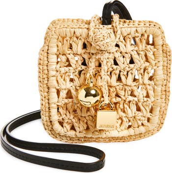 The label's signature sphere and lock charms delicately embellish the open-weave raffia of an elegant AirPod pouch that's complete with a calfskin-leather strap.