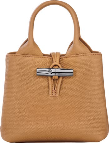 A gleaming toggle closure stands out against the richly textured leather of a scaled-down bag fitted with rolled top handles and an optional crossbody strap for versatile wear.