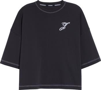 Simon Porte Jacquemus signs off on this boxy, oversized Portuguese-cotton T‑shirt with his elegant ‘J’ monogram in bright‑white stitching, which repeats along the collar, cuffs and hem in crisp contrast.
