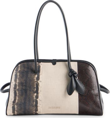 Simon Porte Jacquemus harkens back to the '50s with this structured bowling bag made from blocked panels of snakeskin-embossed leather and cotton-linen canvas. A knotted accent adds a fresh twist to this retro style debuted on runway for the 'La Croisière' collection.