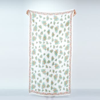 A graceful cascade of natural leaf patterns bordered by mini leaves on a serene white background, this scarf evokes the tranquility of a forest glade and envelopes you in a gentle embrace of botanical beauty and serene elegance. Wear this style as a scarf or a sarong for a day out this summer.
